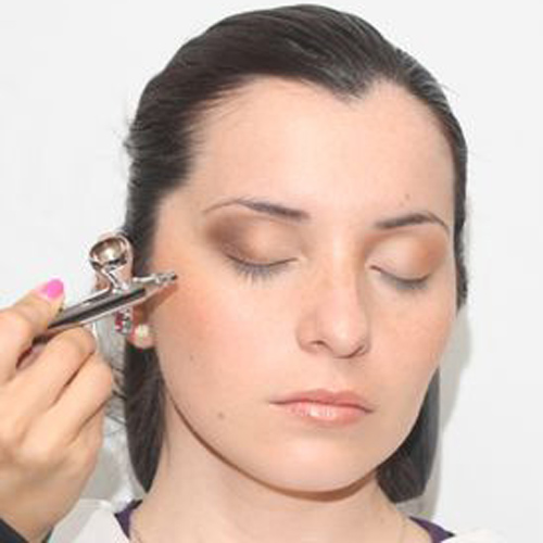 9. Cambiar el color de maquillaje y utilizar otra base de aerógrafo con tono bronce que sirve de sombra, colorete y labios. Al cambiar de color de maquillaje es conveniente introducir en el depósito unas gotitas de limpiador de aerógrafo.