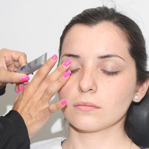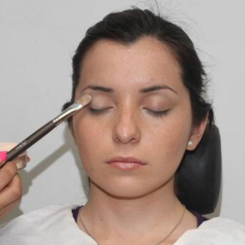 2. Aplicar Primer (fijador de sombras) en todo el párpado, para las sombras realizadas con el aerógrafo es necesario aplicar Primer, porque las sombras son líquidas y requieren fijador.
